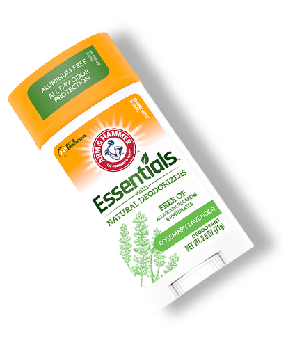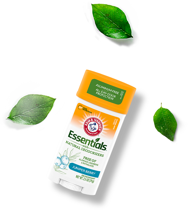 Nuevo ARM & HAMMER ESSENTIALS, el desodorante naturalmente poderoso, con el poder del bicarbonato de sodio.