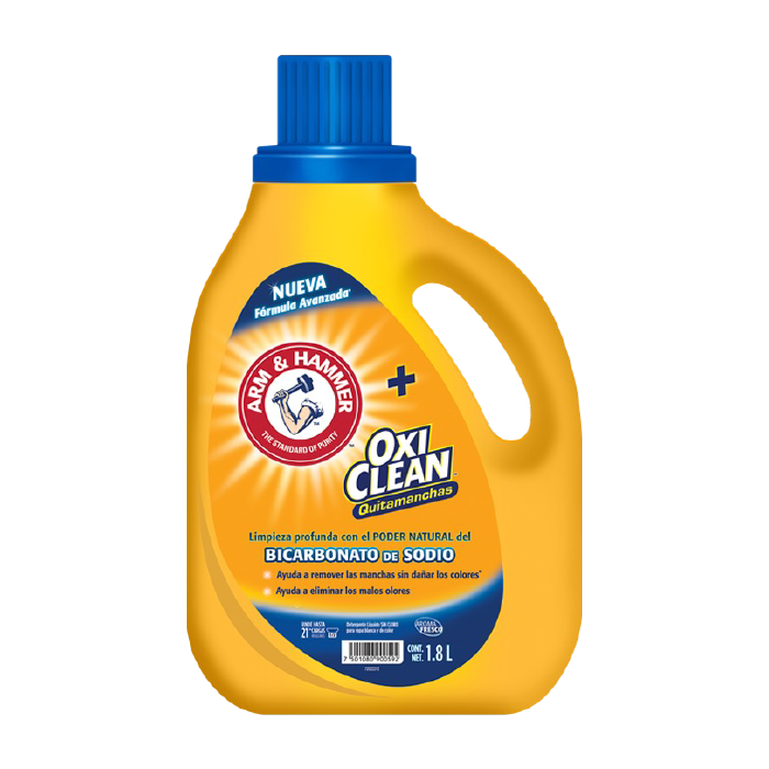 Detergente Arm & HammerTM con el poder natural del Bicarbonato de Sodio y OxiCleanTM Quitamanchas.