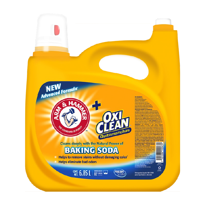 Detergente Arm & HammerTM con el poder natural del Bicarbonato de Sodio y OxiCleanTM Quitamanchas.